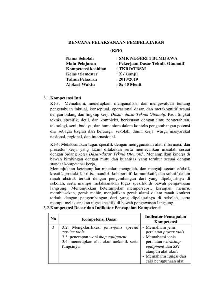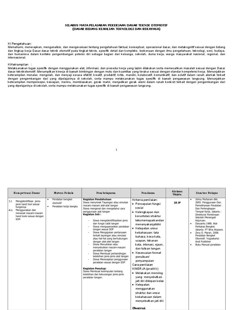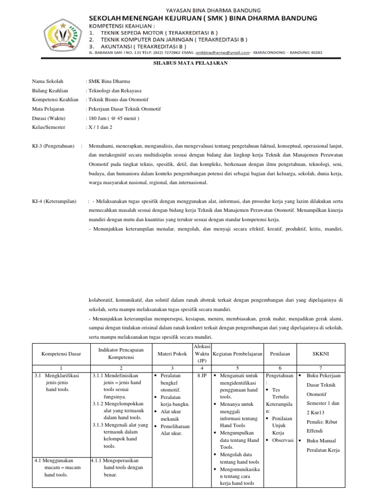 Silabus Pekerjaan Dasar Teknik Otomotif X