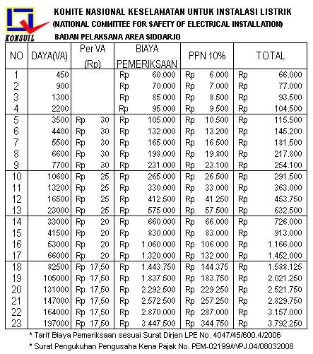 KOMITE NASIONAL KESELAMATAN UNTUK INSTALASI LISTRIK (Badan Pelaksana Area Sidoarjo): BIAYA PEMERIKSAAN INSTALASI LISTRIK (Klik Untuk Memperbesar)