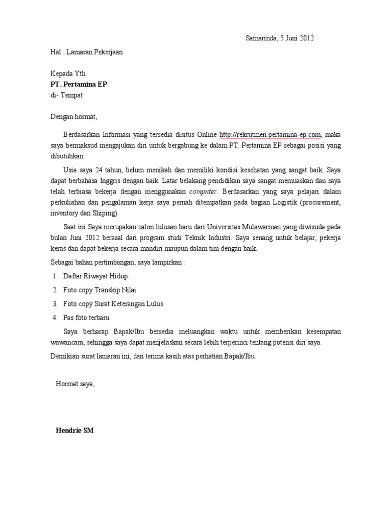 DOC) Contoh Pembuatan Surat Lamaran Kerja Pada PT Pertamina | Marguslan Belibis - Academia.edu