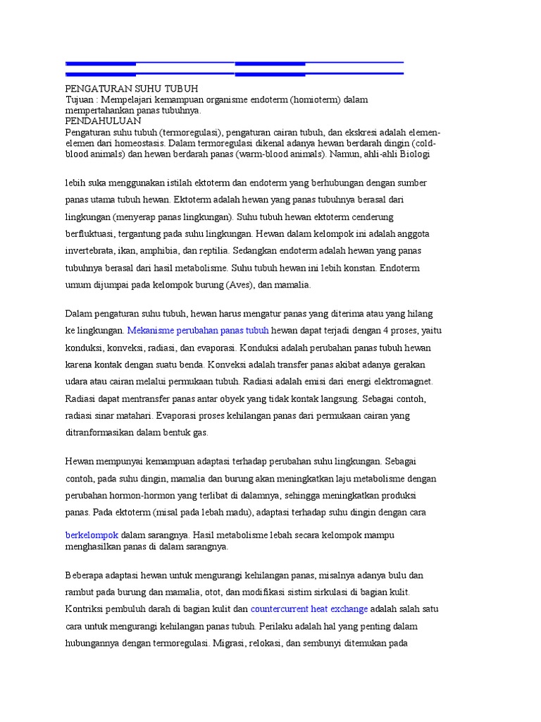 PENGATURAN SUHU TUBUH Tujuan : Mempelajari kemampuan organisme endoterm (homioterm) dalam mempertahankan panas tubuhnya. PENDAHULUAN Pengaturan suhu tubuh (termoregulasi), pengaturan cairan tubuh, dan ekskresi adalah elemen …