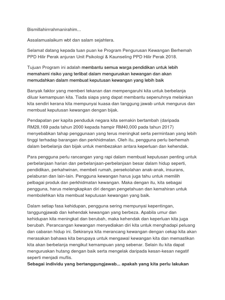 membantu semua warga pendidikan untuk lebih memahami risiko yang terlibat dalam menguruskan kewangan dan akan memudahkan dalam membuat keputusan kewangan yang lebih baik