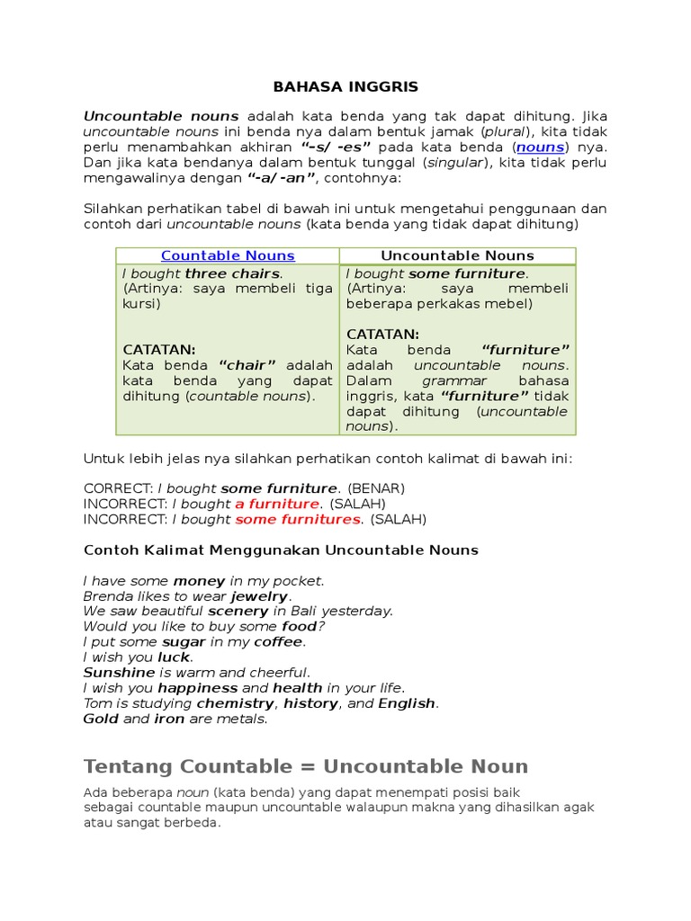 Countable dan Uncountable Nouns pada Bahasa Inggris.docx | Kata Benda | Aturan
