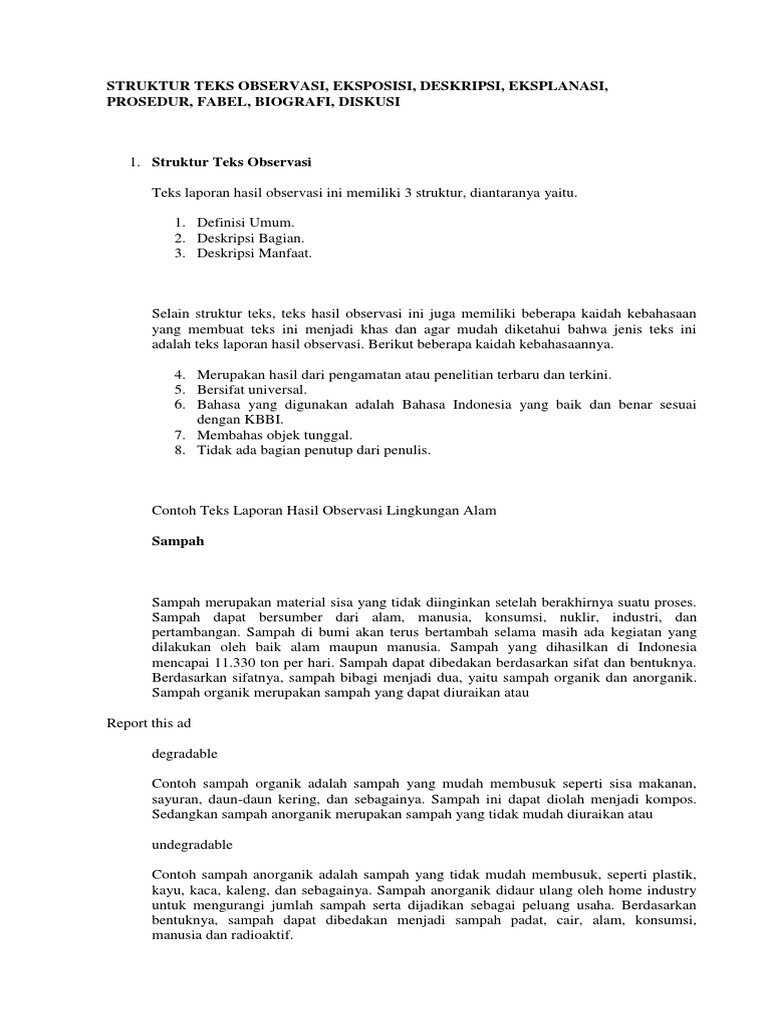Struktur Teks Observasi, Eksposisi, Deskripsi, Eksplanasi, Prosedur, Fabel, Biografi, Diskusi