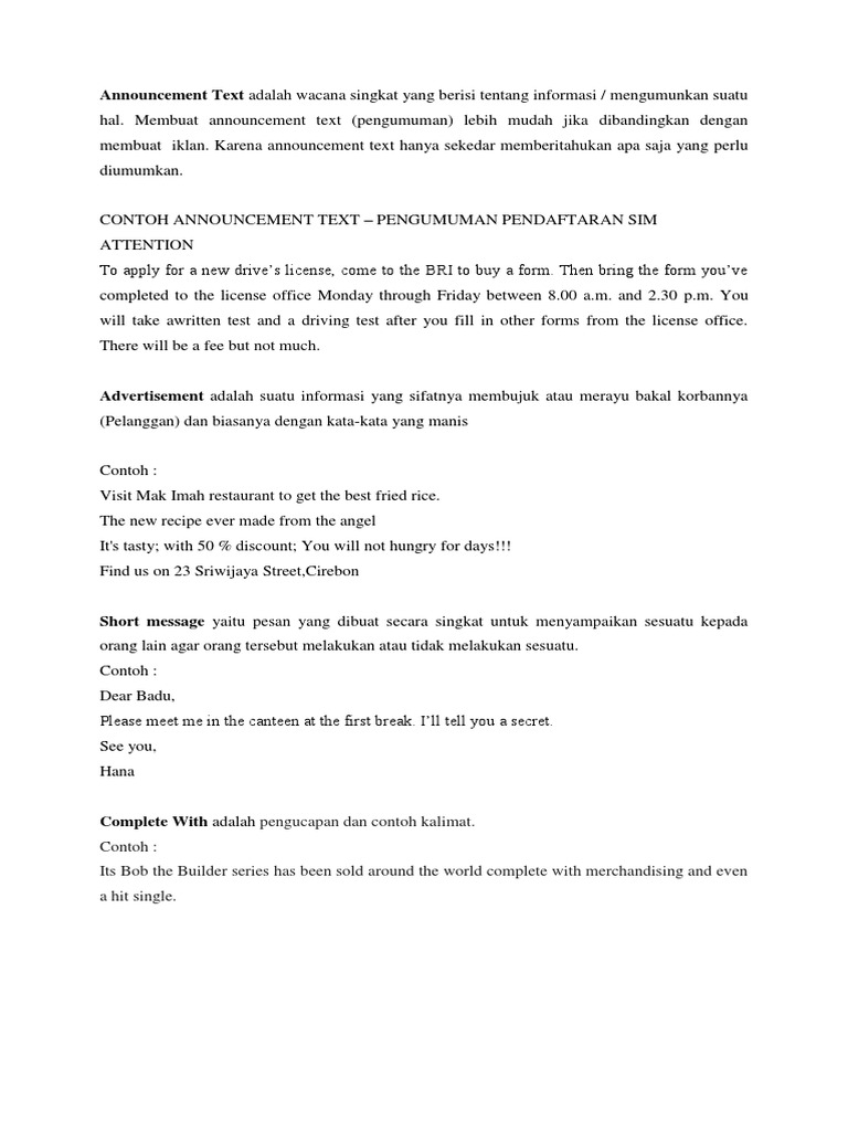 Announcement Text Adalah Wacana Singkat Yang Berisi Tentang Informasi