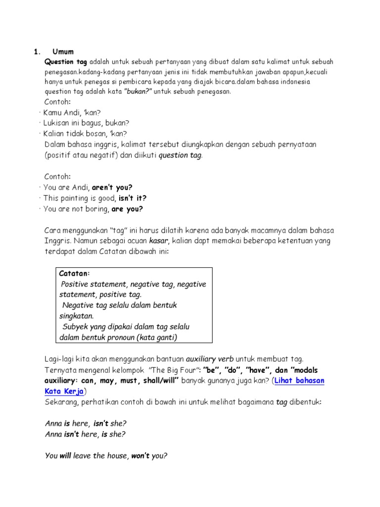 1. Umum: Question tag adalah untuk sebuah pertanyaan yang dibuat dalam satu kalimat untuk sebuah