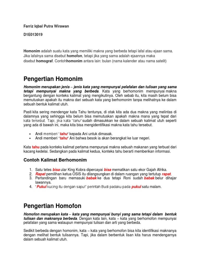 Pengertian Homonim: Farriz Iqbal Putra Wirawan D1E013019