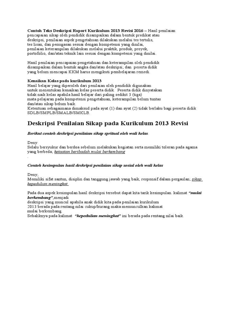 Contoh Teks Deskripsi Raport Kurikulum 2013 Revisi 2016