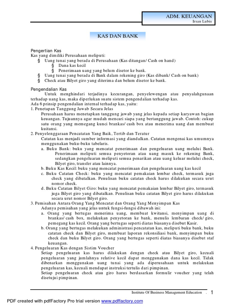 PDF) ANALISIS PENGENDALIAN INTERN SISTEM PENERIMAAN DAN PENGELUARAN KAS DALAM MENINGKATKAN KUALITAS LAPORAN ARUS KAS (STUDI KASUS PADA KLINIK UTAMA BANDUNG EYE CENTER)
