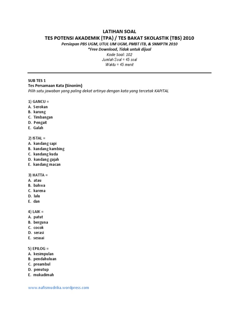 Contoh Soal Dan Materi Pelajaran 9: Contoh Soal Psikotes Lawan Kata Dan Jawabannya