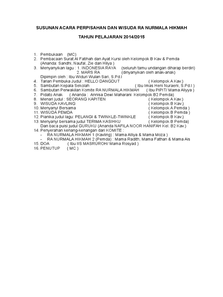 Susunan Acara Perpisahan Dan Wisuda Ra Nurmala Hikmah