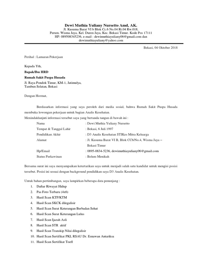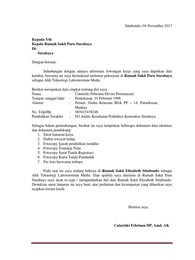 Surat Lamaran Pekerjaan D3 Analis Kesehatan 2018