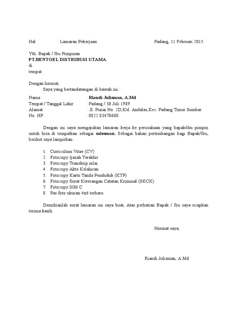 Contoh Surat Lamaran Kerja - Lowongan Kerja Kalimantan Tengah