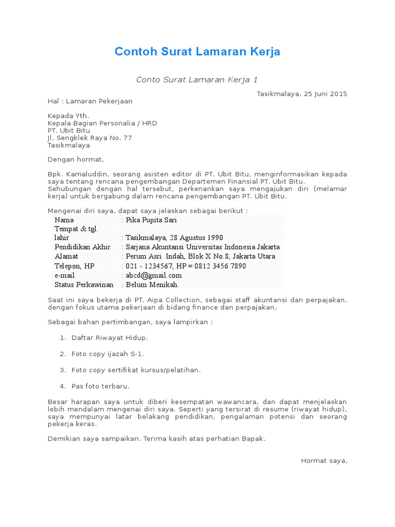 Contoh Surat Lamaran Kerja Gabungan Dan Terpisah