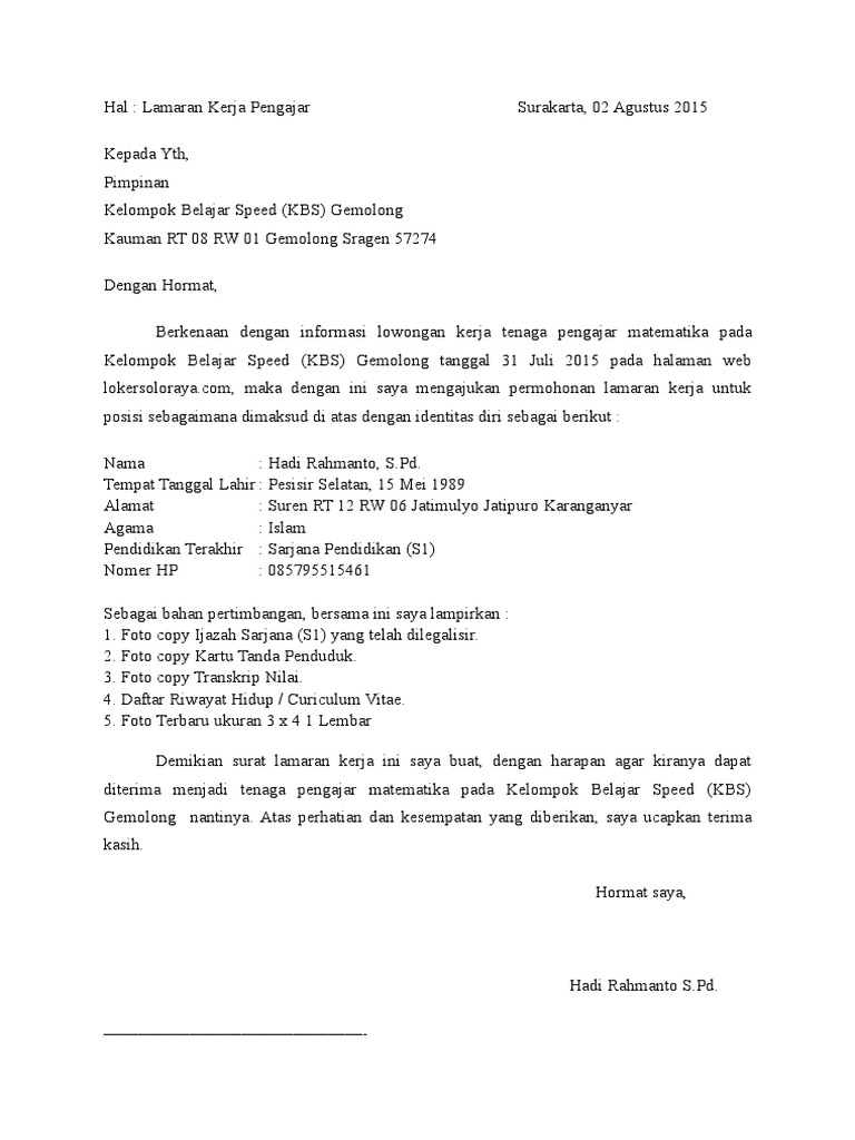 Contoh Surat Lamaran Kerja Jadi Sebagai Pengajar Kursus Dan Bimbingan Belajar