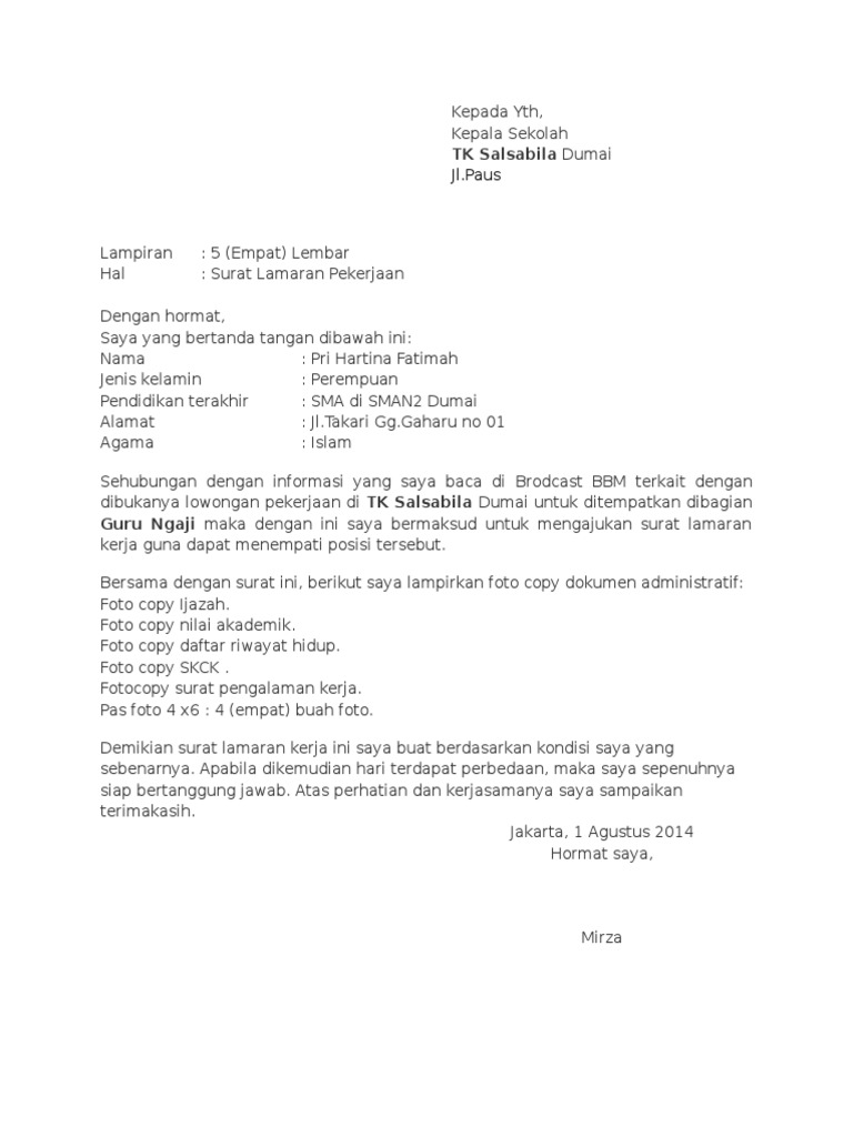DOC) Contoh Surat Lamaran Kerja Guru | qorri aina - Academia.edu
