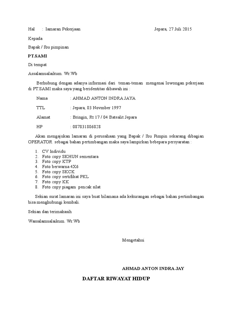 Contoh Surat Lamaran Kerja Di Pt Pwi Jepara