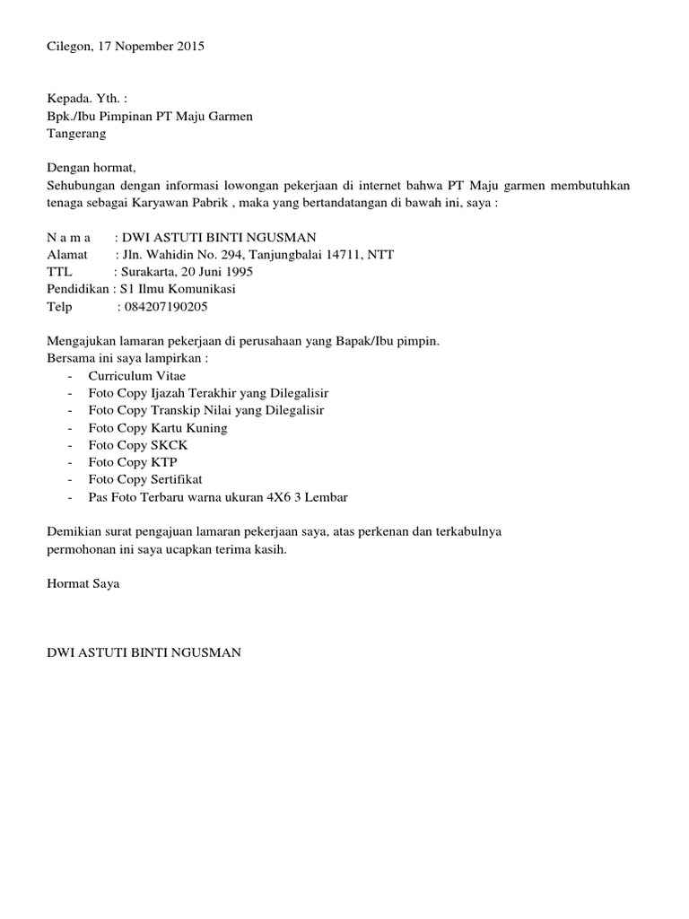 Contoh Lamaran Kerja Di Pabrik