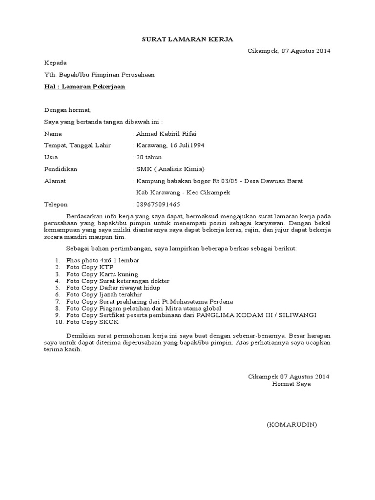 DOC) CONTOH FORMAT SURAT LAMARAN KERJA UNTUK LULUSAN SMA/SMK/MA/ SEDERAJAT | Achmad Hilmi - Academia.edu