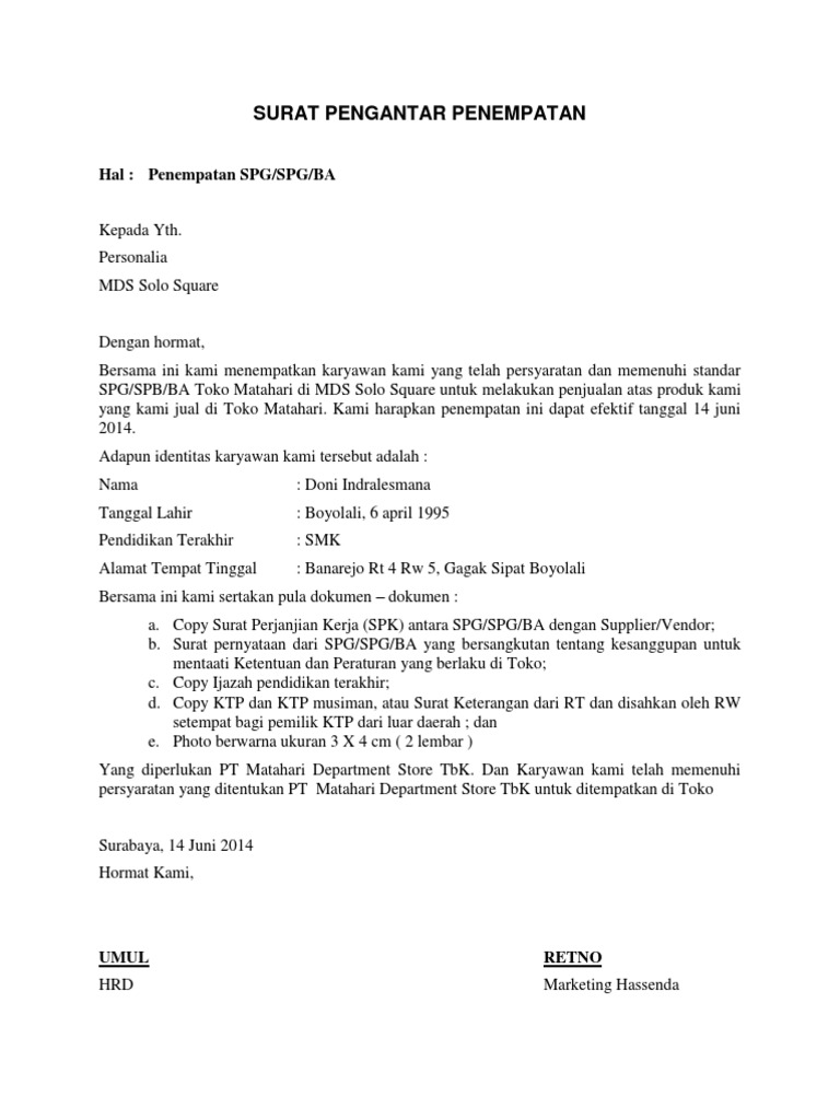 Contoh Surat Lamaran Kerja Spg Matahari - Contoh Seputar Surat