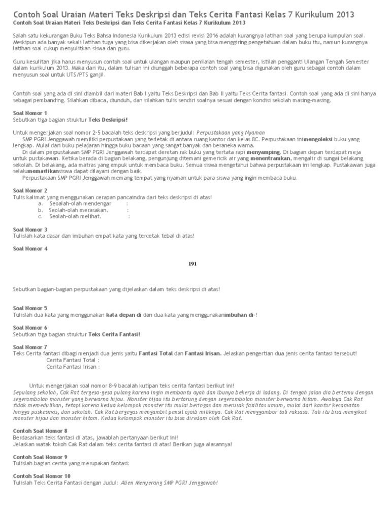 Contoh Soal Uraian Materi Teks Deskripsi dan Teks Cerita Fantasi Kelas 7 Kurikulum 2013