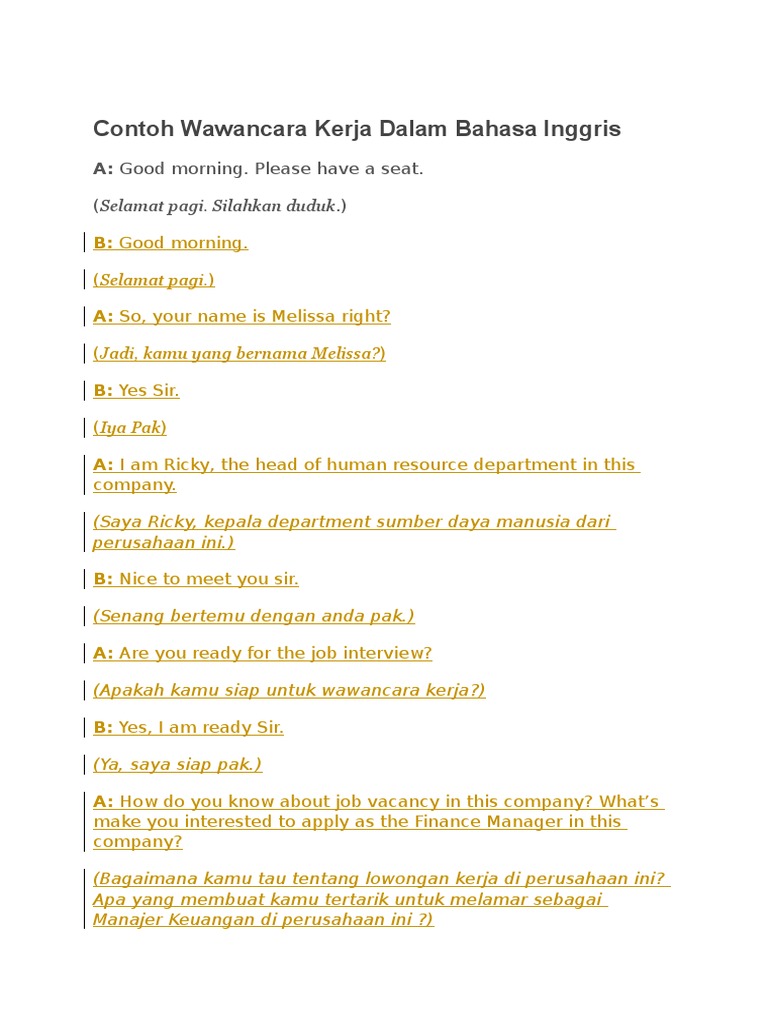 DOC) Contoh Wawancara Kerja Dalam Bahasa Inggris Beserta Arti dan Strategi Menjawab POSTED BY SULHAM SYAHID POSTED ON 11:07 PM | Erni Yuliati - Academia.edu