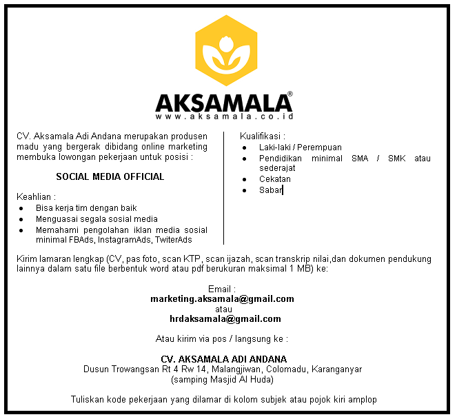 Lowongan Kerja di CV Aksamala Adi Andana - Surakarta (Customer Service dan Social Media Spesialis) - Portal Info Lowongan Kerja Terbaru di Solo Raya - Surakarta 2020