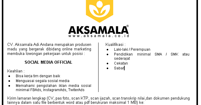 Lamar Lowongan Kerja Aksamala Adi Andana CV Terbaru 2020 | Jobs.id
