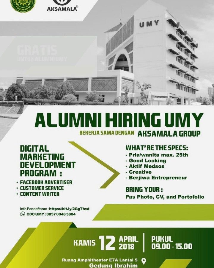 UMY on Twitter: “Rekruitment PT.AKSAMALA // Kamis, 12 April 2018 (09.00-15.00) // Ruang Amphitheater E7A Lt.5 Gd. Ibrahim UMY // Info CDC UMY 085700483884 #LowkerUMY… https://t.co/QearGUKCY6”