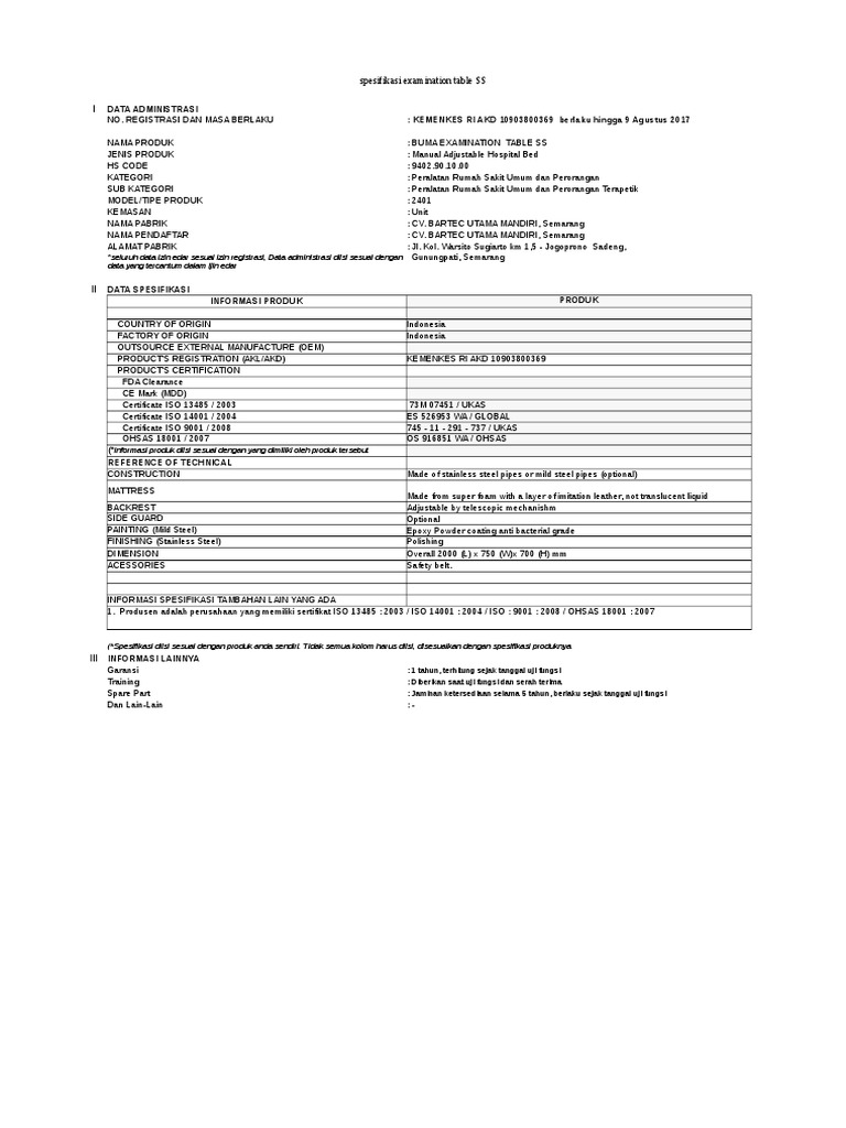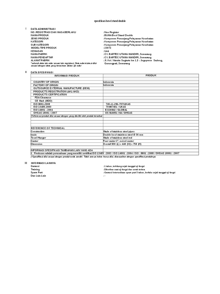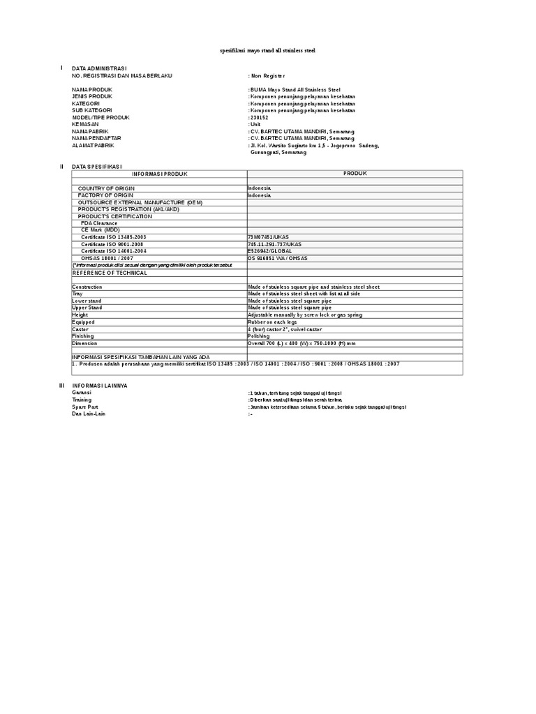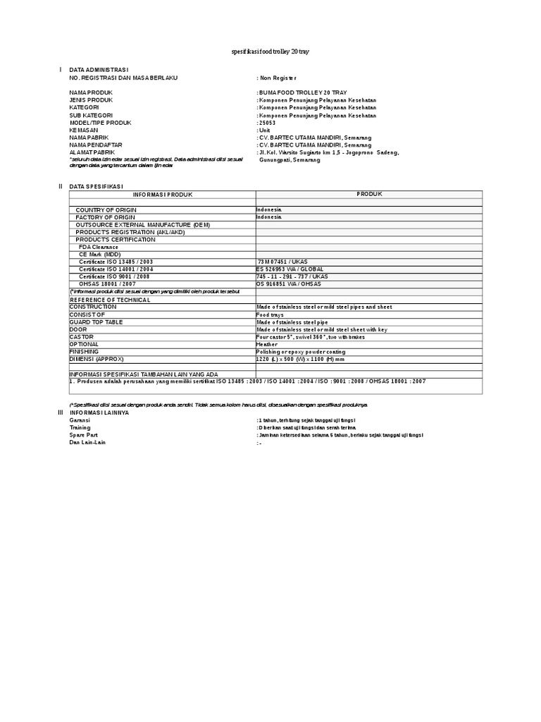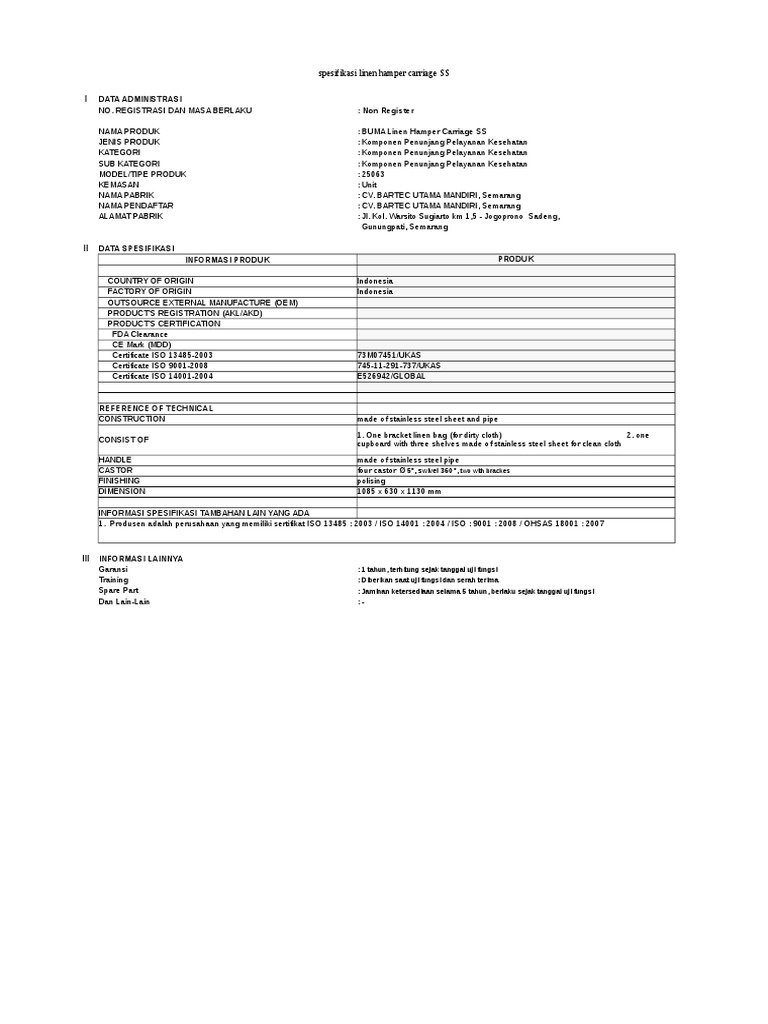 I DATA ADMINISTRASI NO. REGISTRASI DAN MASA BERLAKU : TU.02.02/5/5221/2017 NAMA PRODUK : BUMA / LAUNDRY TROLLEY STANDARD SS JENI