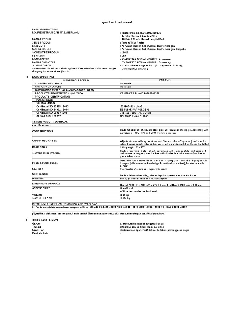 5. Spesifikasi 1 Crank Manual