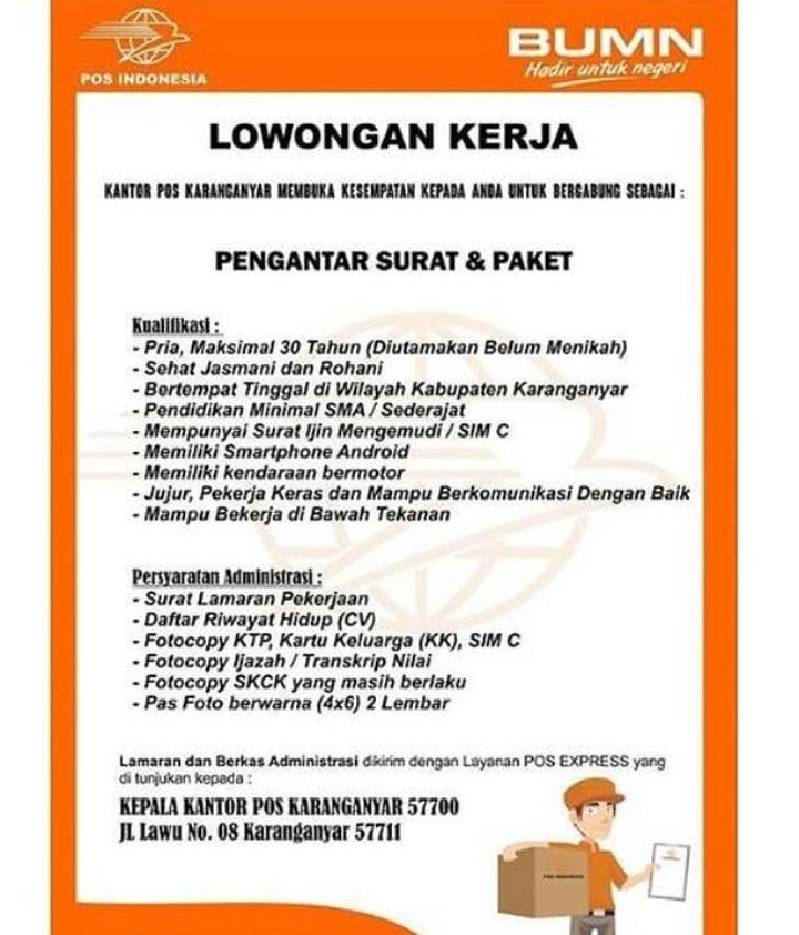 LOWONGAN KERJA POS INDONESIA (BUMN) sebagai Pengantar Surat dan Paket - Bursa Lowongan Kerja