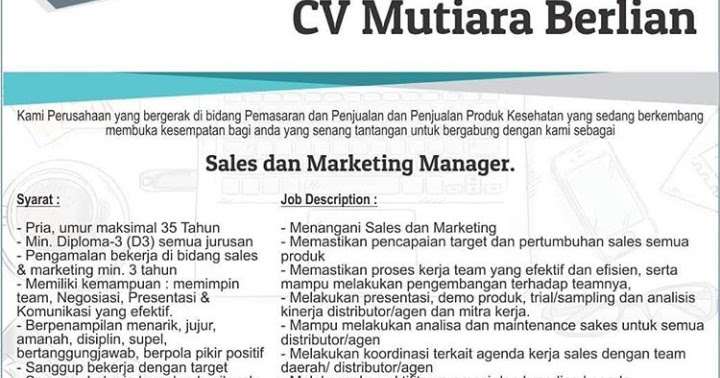 LOWONGAN KERJA SALES DAN MARKETING MANAGER di CV. MUTIARA BERLIAN di Solo - Bursa Lowongan Kerja