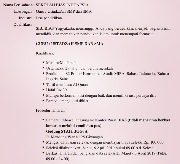LOWONGAN KERJA GURU/USTADZAH SMP DAN SMA SEKOLAH BIAS INDONESIA di Yogyakarta - Bursa Lowongan Kerja