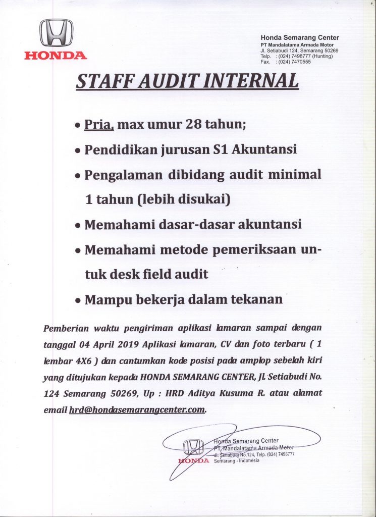 LOWONGAN KERJA STAFF AUSIT INTERNAL di Honda Semarang Center ( PT. Mandalatama Armada Motor) - Bursa Lowongan Kerja