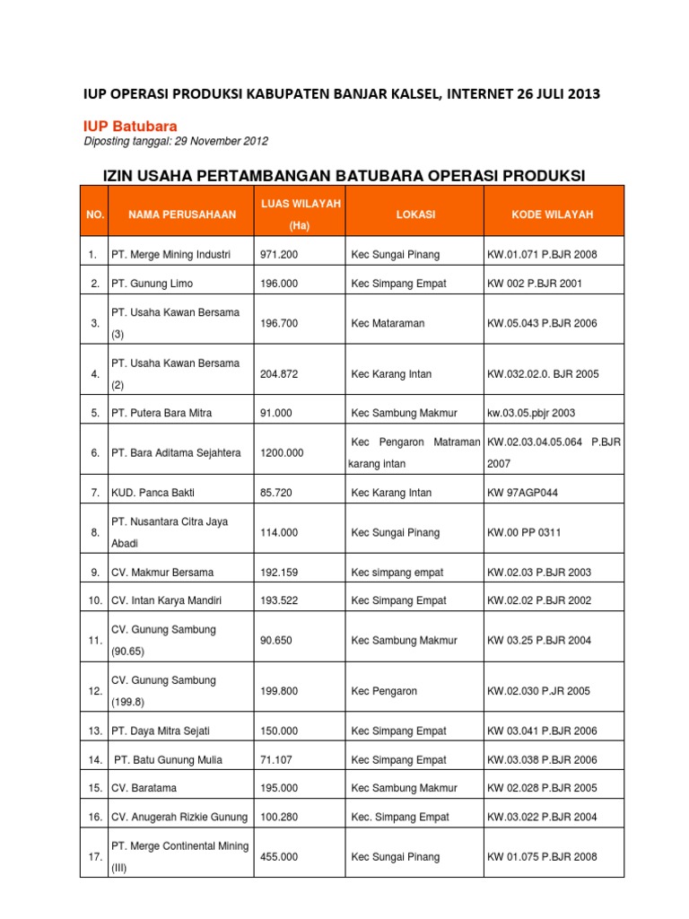Iup Operasi Produksi Kabupaten Banjar Kalsel 2012