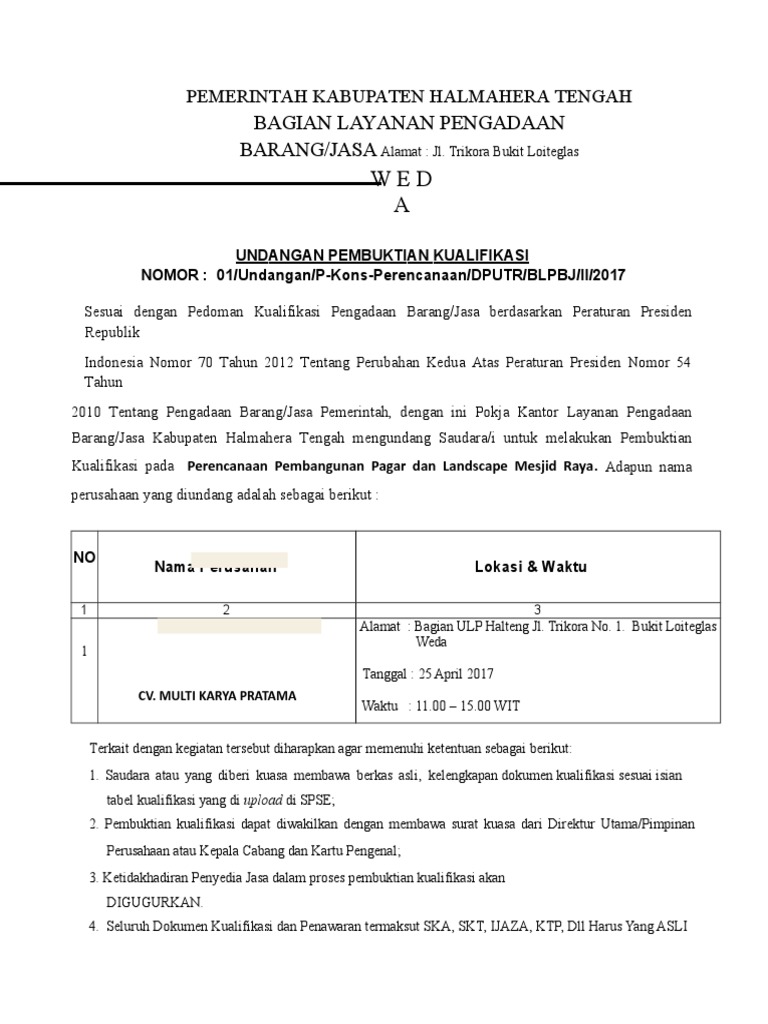UNDANGAN CV. MULTI KARYA PRATAMA -Perencanaan Pembangunan Pagar Dan Landscape Mesjid Raya