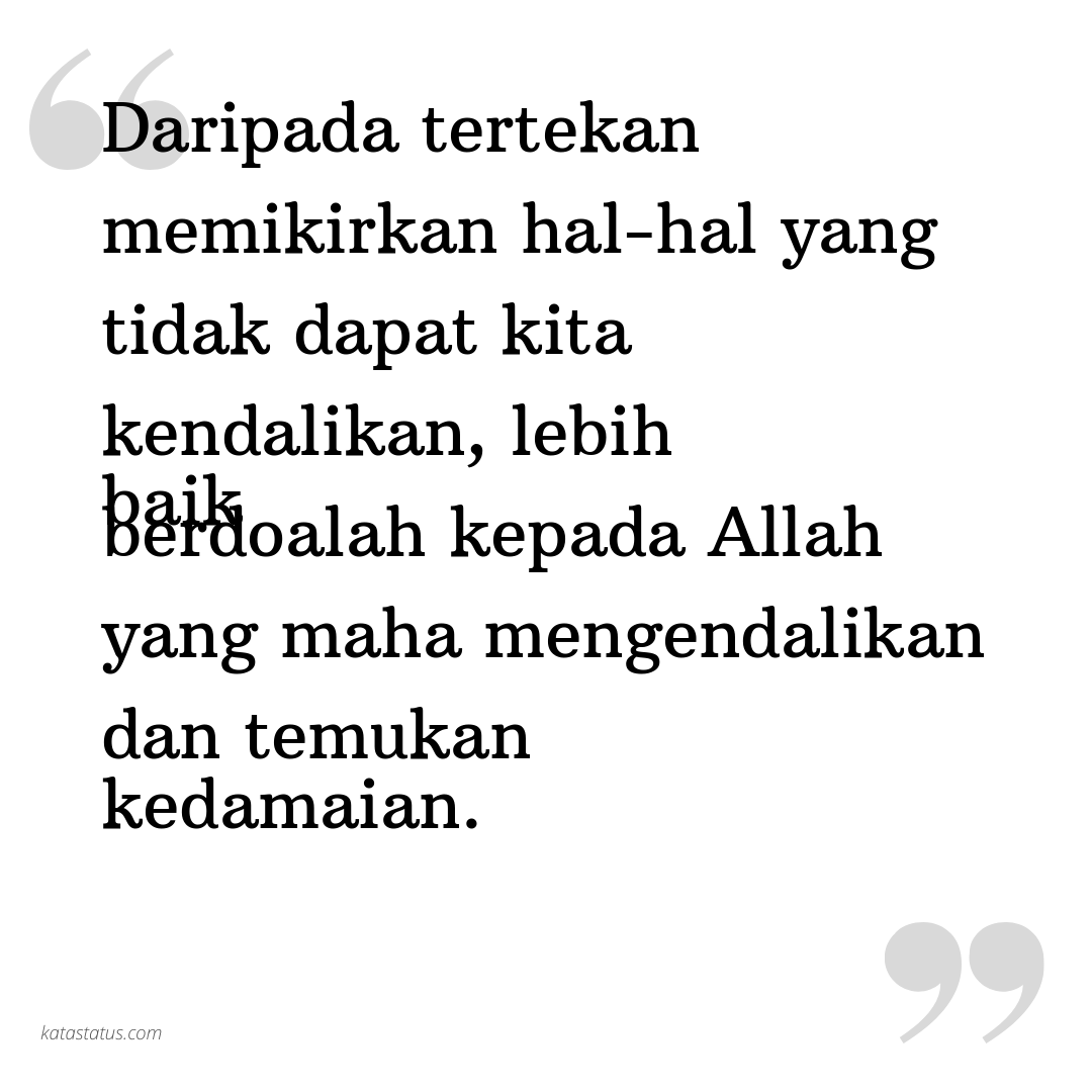 Kata Status Kata Bijak Islami: Daripada tertekan memikirkan hal-hal yang tidak dapat kita kendalikan, lebih baik berdoalah kepada Allah yang maha mengendalikan dan temukan kedamaian. - KataStatus.COM