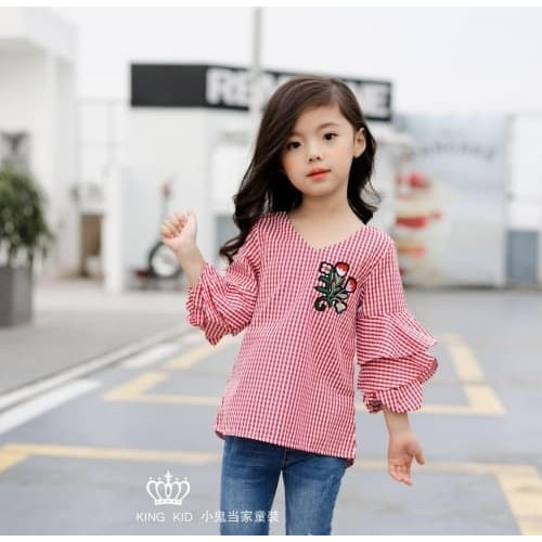 Baju Atasan Anak Perempuan Blouse Kotak Merah Lengan Balon Tumpuk | Shopee Indonesia