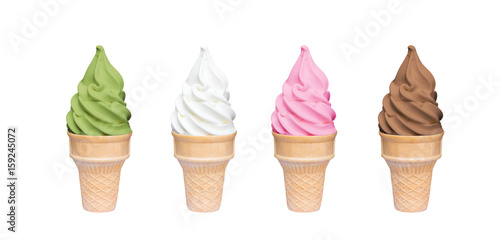 Soft serve ice cream of vanilla, strawberry, chocolate and green tea flavours on crispy cone isolated on white background (clipping path included) - Buy this stock photo and explore similar images at