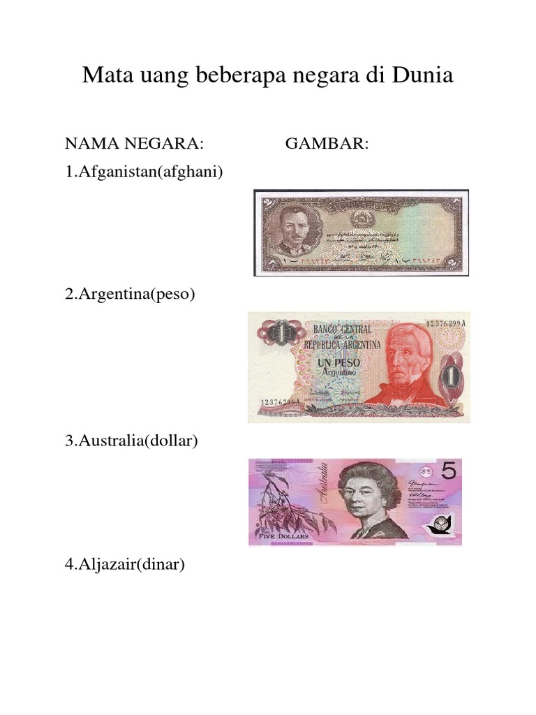 Mata uang beberapa negara di Dunia: Nama Negara: Gambar: 1.Afganistan(afghani)