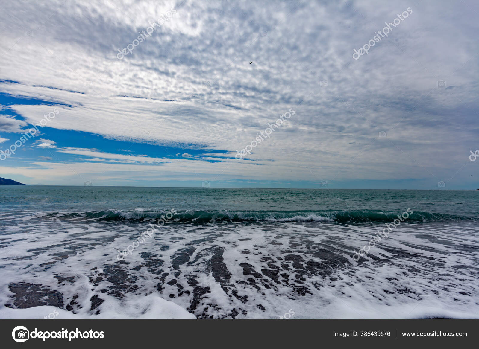 Percikan Ombak Berguling Pasir Dan Batu Melawan Laut Biru Dan — Stok Foto © Alyona_Shu #382350924
