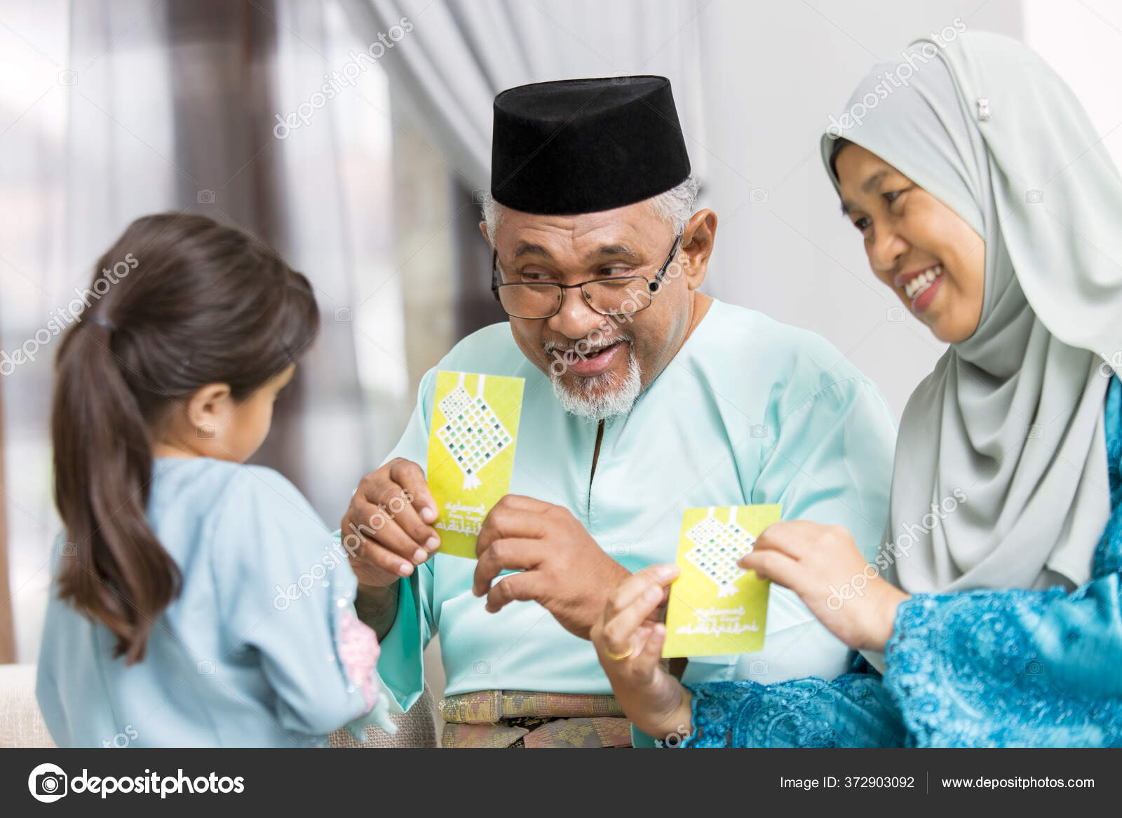 Pasangan Muslim Senior Menunjukkan Amplop Hijau Untuk Cucu Mereka — Stok Foto © image_hit #372903092