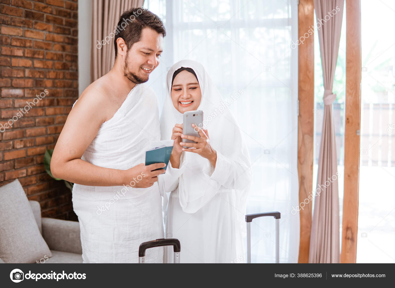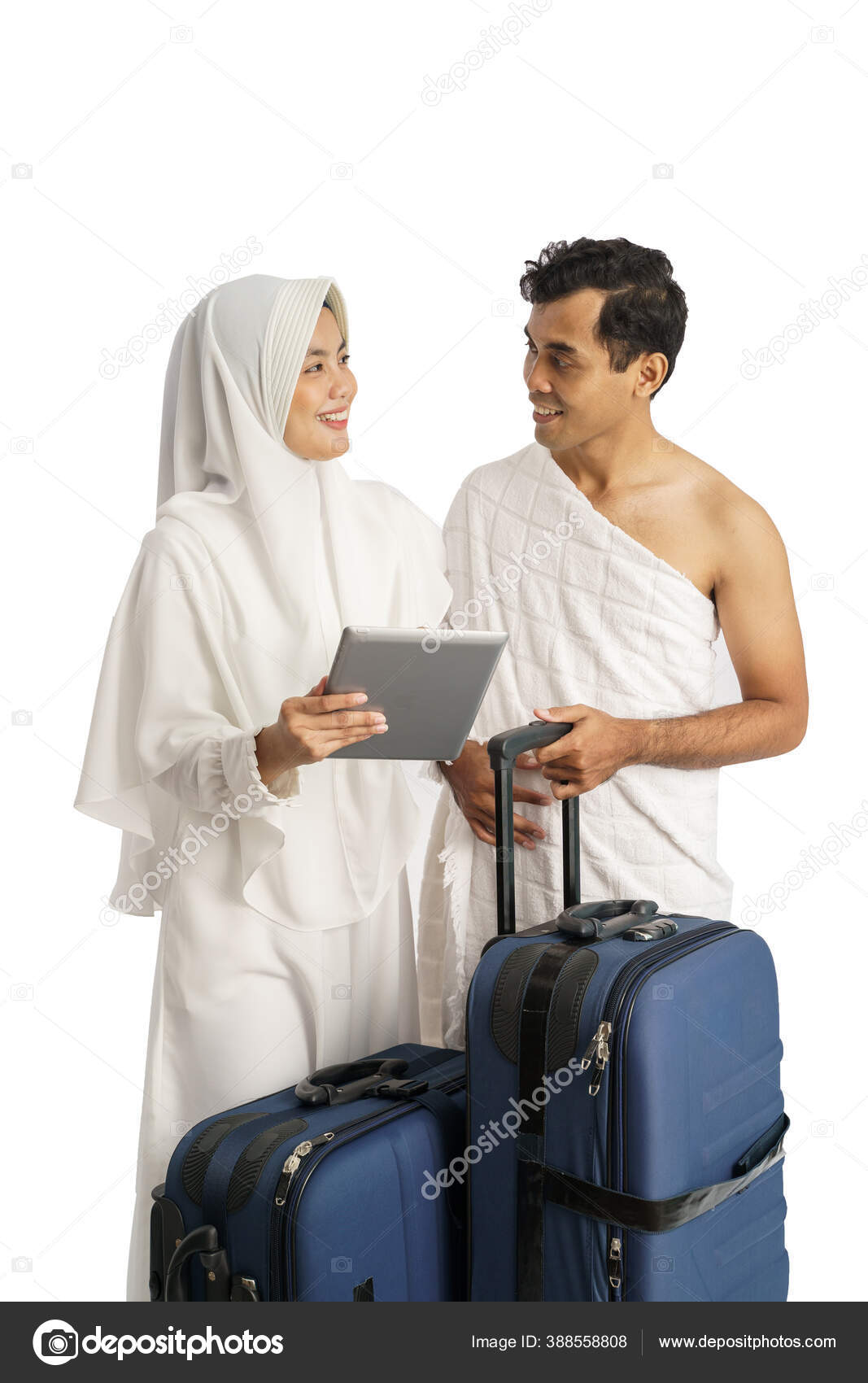 Pasangan muslim membuat panggilan telepon sementara umrah dan haji — Stok Foto © odua #388625396