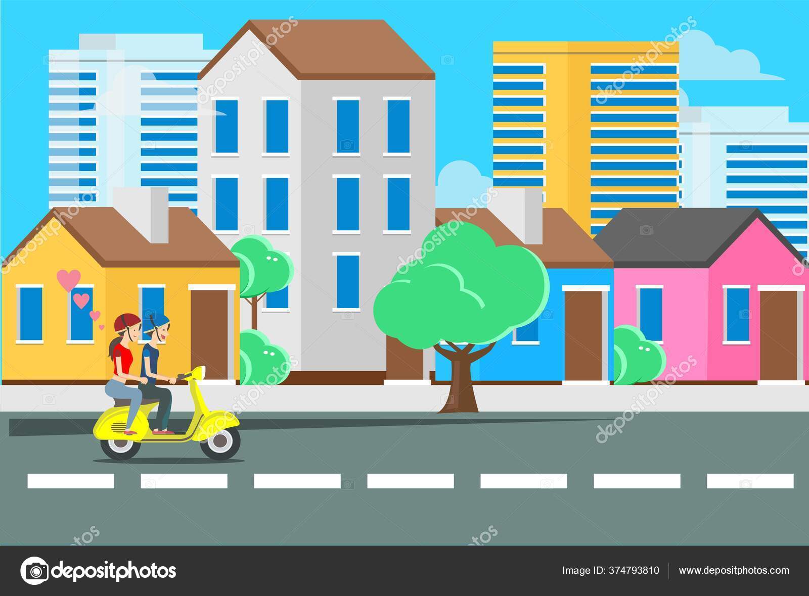 Ilustrasi Datar Dari Seorang Pemuda Mengendarai Skuter Dengan Seorang Pacar — Stok Vektor © Fectopus #374793810