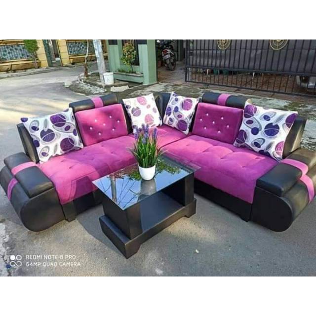 Jual sofa minimalis kayu 221 warna ungu plus bantal plus meja bentuk L - Kab. Tangerang - Toko MajuBaru Furnituree | Tokopedia