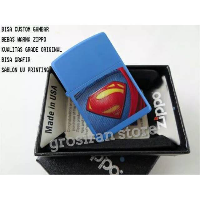 ZIPPO SUPERMAN BLUE MATTE BIRU CUSTOM LOGO TULISAN NAMA GAMBAR PRINT CLUB PERUSAHAAN MOTOR MOBIL | Shopee Indonesia
