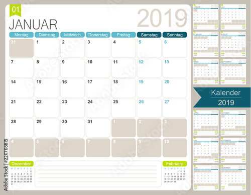 German calendar 2019 / German calendar planner for year 2019, week starts on Monday, set of 12 months January - December, simple calendar template, desk planning calendar, vector illustration - Buy this