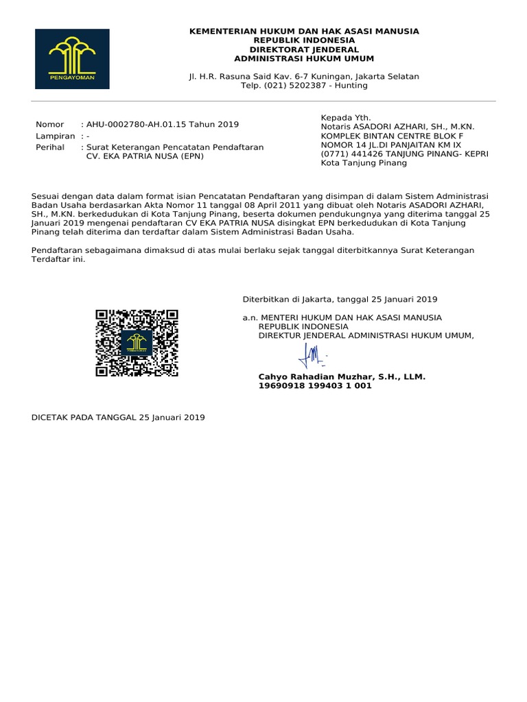 Surat Keterangan Pencatatan Pendaftaran AHU-0002780-AH.01.15 Tahun 2019.pdf