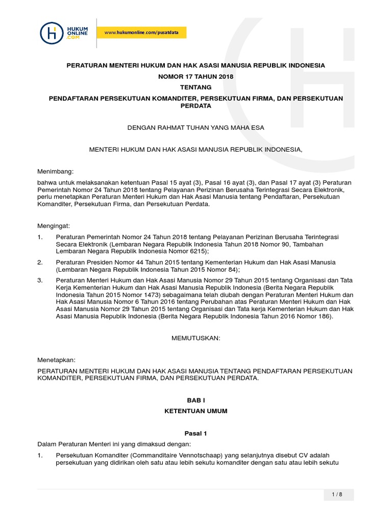 Permenkumham No. 17 Tahun 2018 Tentang Pendaftaran CV, Firma, Dan Persekutuan Perdata