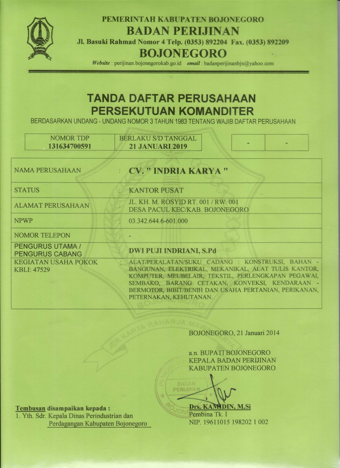 TDP (Tanda Daftar Perusahaan) CV – ptspkelkalianyar